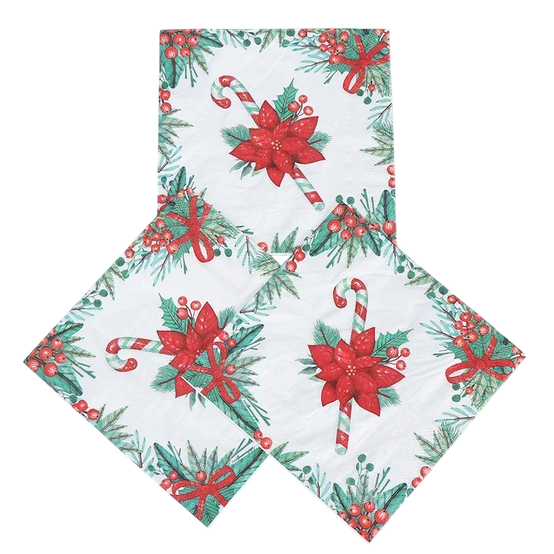 Papierové obrúsky s vianočným motívom cukrovej paličky a vianočnej hviezdy prinášajú na váš stôl krásnu sviatočnú atmosféru. Kombinácia tradičných vianočných symbolov, ako sú červeno-biele cukrové paličky a elegantné kvety vianočnej hviezdy, vytvára dekoratívny dizajn, ktorý dokonale doplní slávnostne prestretý stôl počas zimných sviatkov.
