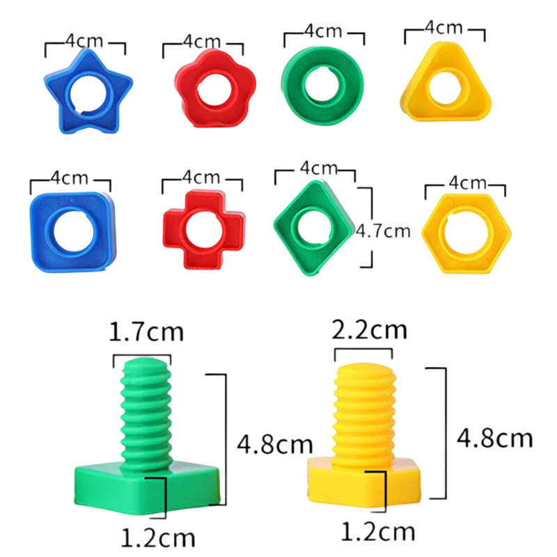 Táto vzdelávacia sada plastových skrutiek je navrhnutá tak, aby deti zábavnou formou rozvíjali svoje motorické a logické schopnosti. Každý dielik sa skladá z jednej skrutky a jednej matice, ktoré do seba presne zapadajú a umožňujú jednoduché skrutkovanie a odskrutkovanie. Deti si pri hre precvičujú úchop, koordináciu ruky a oka aj trpezlivosť. Vďaka rôznym tvarom je každé skladanie trochu iné a stále zaujímavé. Hračka je vhodná na samostatné hranie aj spoločnú aktivitu s rodičmi.