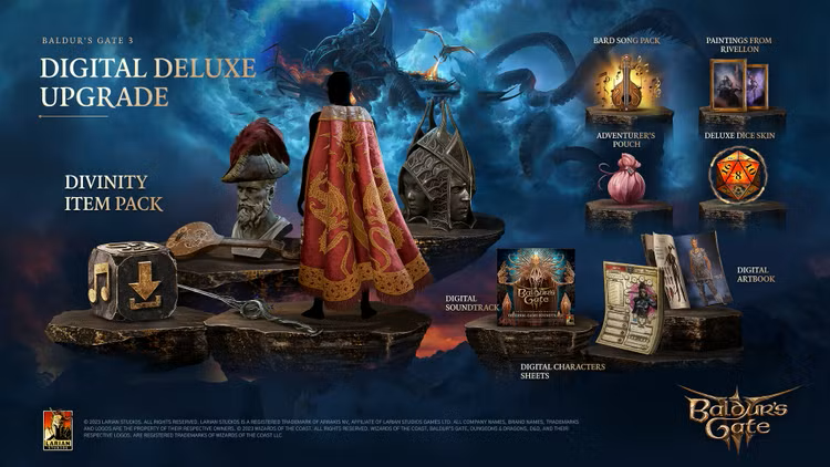 Pre tých, ktorí chcú z Baldur's Gate 3 vyťažiť trochu viac, obsahuje obsah upgradu Digitálnej Deluxe Edície hernú kozmetiku, ako je unikátny vlastný kostkový skin, ktorým sa môžete pochváliť svojim priateľom, a tiež praktické herné predmety, ako je The Mask of the Shapeshifter z Divinity: Original Sin 2.