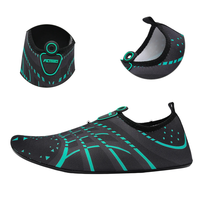 Spodná časť je vyrobená z odolnej pryže, ktorá chráni pred ostrými kameňmi, mušľami alebo horúcim pieskom. Špeciálna protiskluzová podrážka minimalizuje riziko uklznutia na mokrých dlaždiciach či klzkých skalách. Vďaka flexibilnej konštrukcii sa obuv ľahko prispôsobí tvaru chodidla a umožňuje prirodzený pohyb pri plávaní aj chôdzi.