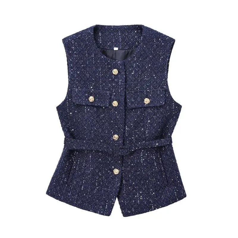 Stylová dámska vesta s pásikom v páse a vreckami na prsiach. Elegantný strih s výstrihom do O a zapínaním na gombíky pre moderný vzhľad. Celý popis
