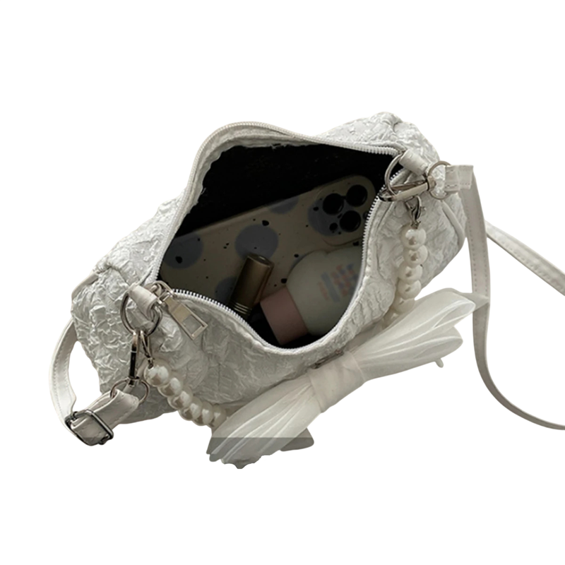 Táto dámska kabelka zaujme svojím elegantným a jemným vzhľadom, ktorý je doplnený dekoratívnou mašľou a výraznou perlovou rúčkou. Vďaka rozmerom 23 x 8 x 15 cm pôsobí kompaktné, predsa len ponúka dostatok priestoru pre základné osobné veci. Kombinácia bavlny a polyesteru vytvára príjemný textilný povrch s ľahkou konštrukciou. Kabelka je ideálnou voľbou pre spoločenské udalosti, slávnostné príležitosti aj štýlové vychádzky. Celkový dizajn pôsobí jemne, ženským dojmom a ľahko doplní elegantný outfit.