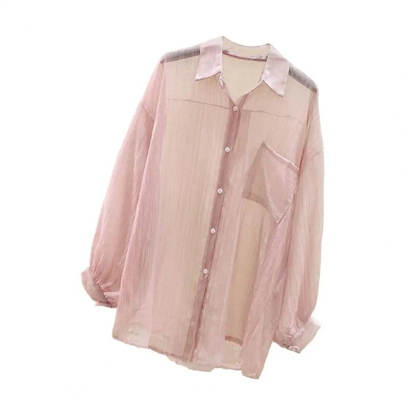 Dámska ľahká priesvitná košeľa s dlhým rukávom Voľný strih s golierom a vreckom Elegantná košeľa na gombíky do mesta aj k vode