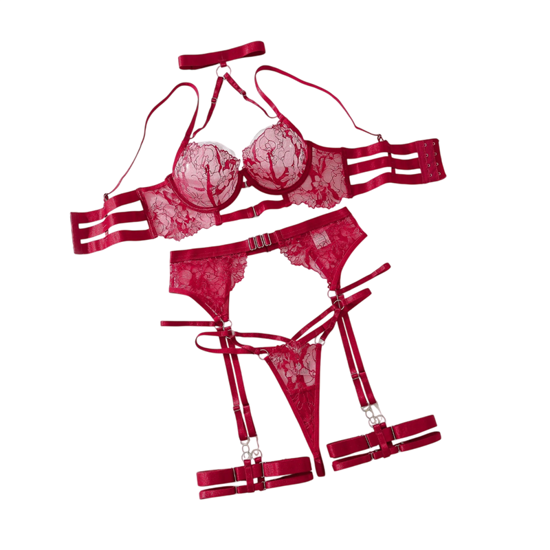 Dámska spodná súprava je tvorená podprsenkou a nohavičkami doplnenými o výrazné pásikové a podväzkové prvky. Krajkové spracovanie je dominantným prvkom, ktorý sa prelína celým dizajnom. Konštrukcia jednotlivých častí je navrhnutá tak, aby vytvárala ucelený vzhľad. Materiál z polyesteru prispieva k ľahkosti a prispôsobeniu pri nosení. Súprava je vhodná na každodenné využitie aj ako doplnok spodného prádla.