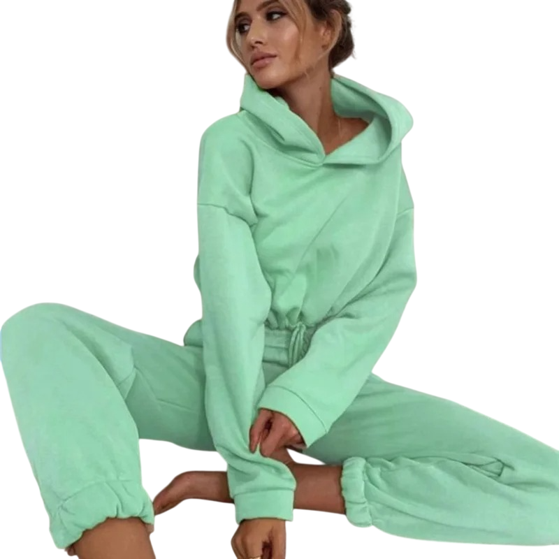 Dámska jednobarevná súprava s teplákmi a crop top mikinou s kapucňou, vyrobená z polyesteru. Ideálna na pohodlné nosenie a športové aktivity. Celý popis