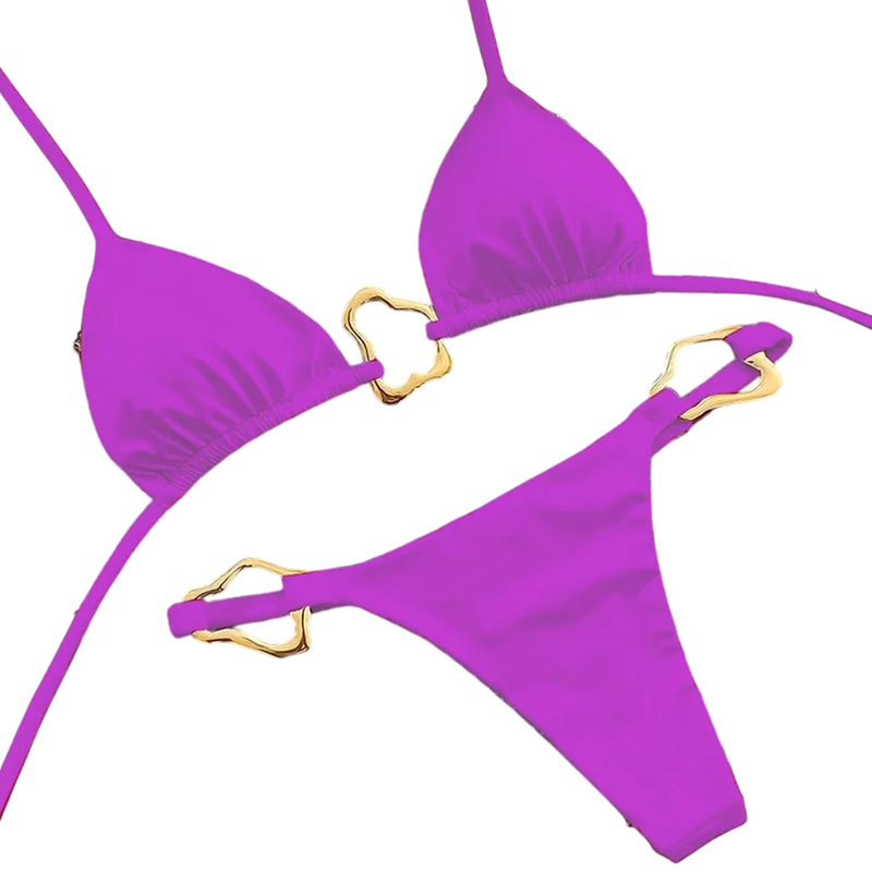 Elegantné bikiny s trojuholníkovým strihom, kovovými sponami a nohavičkami s výrezmi – ideálne na pláž, dovolenku alebo fotenie. Celý popis