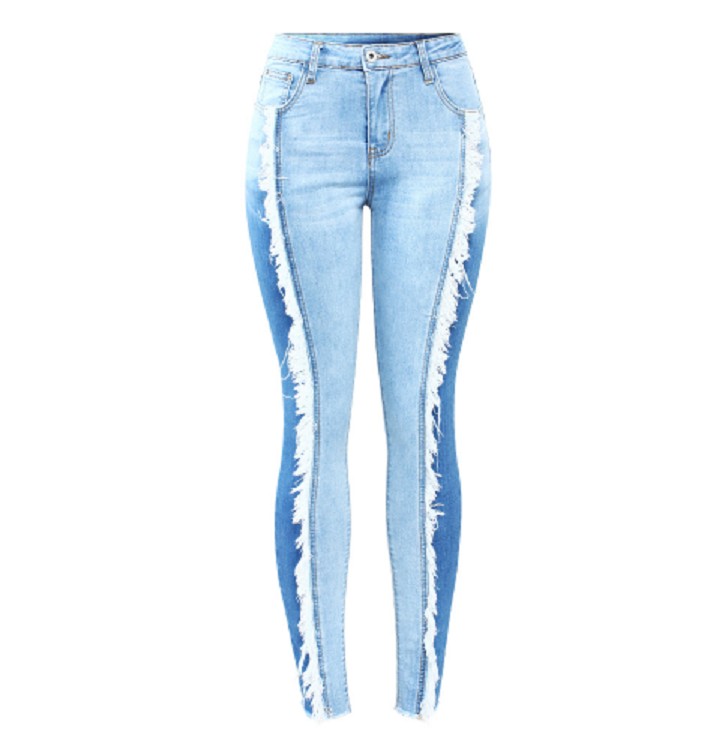 Buďte štýlová s týmito džínsami s bielymi strapcami na prednej a zadnej strane džínsov.