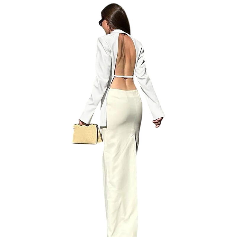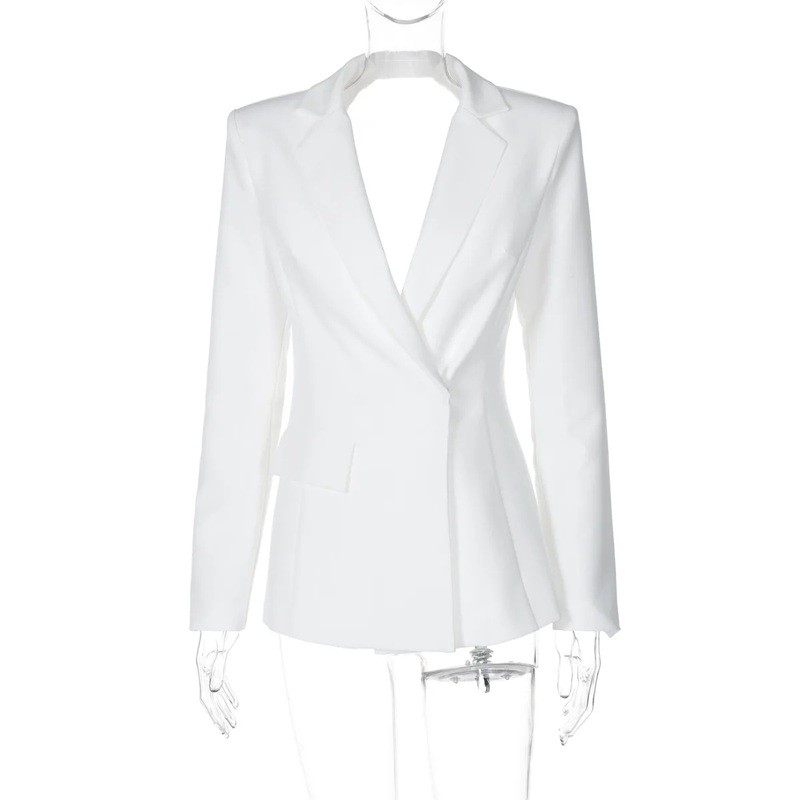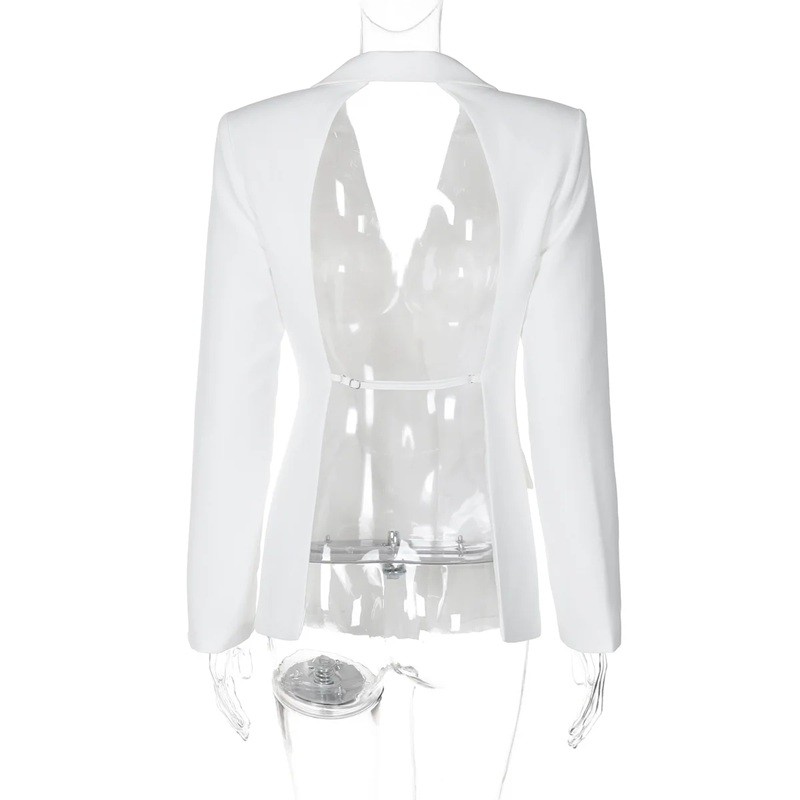 Moderné dámske sako s límcom, vreckami a voľnými chrbtom s prackou. Pohodlný strih z polyesteru a spandexu pre každodenné aj spoločenské nosenie. Celý popis