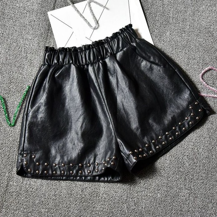 Kožené kraťasy zdobené cvočky na dolnom leme si obľúbite.