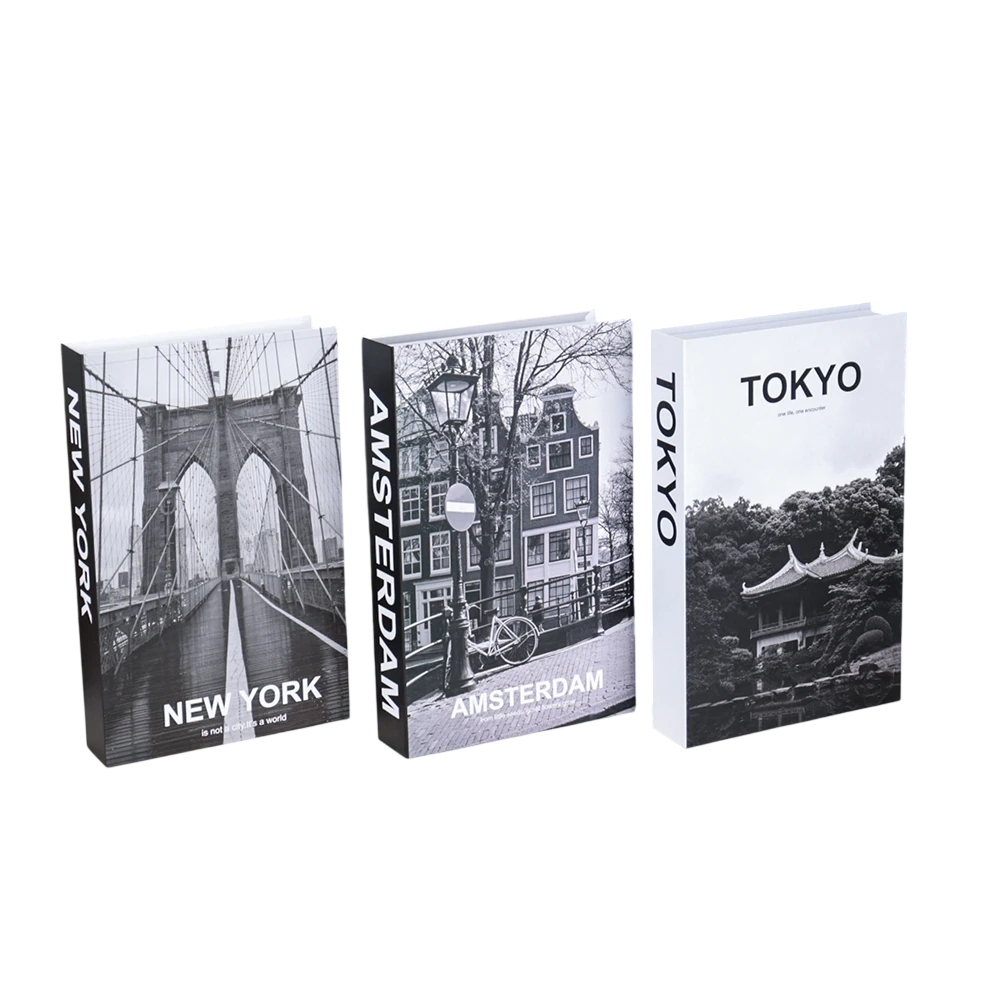 Dekoračné falešné knihy 3 ks Neotevíratelné čiernobiele knihy New York Amsterdam Tokyo moderná dekorácia