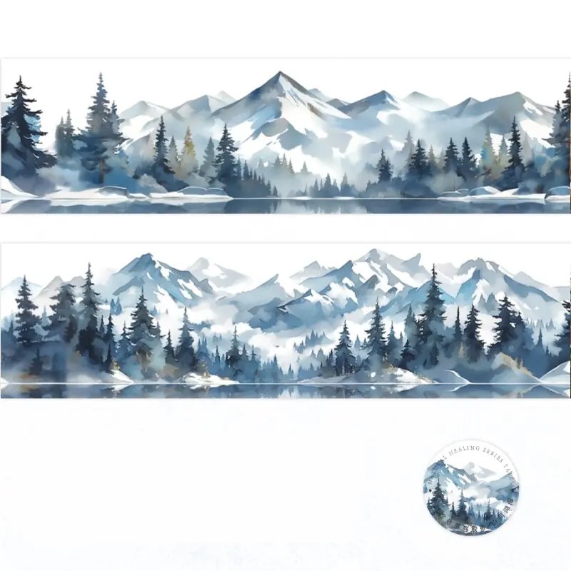 Vodoodolná dekoratívna páska s motívom hôr a lesov pre DIY tvorenie, zdobenie zošitov, kelímkov a denníkov, jednoduchá aplikácia a čistý vzhľad. Celý popis
