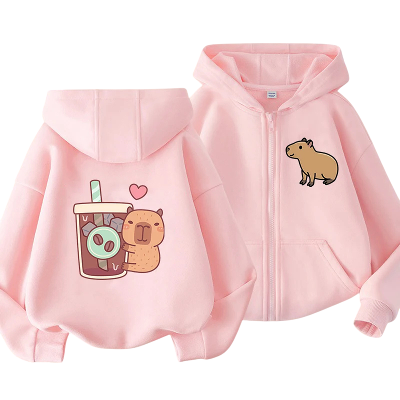 Roztomilá detská mikina na zips s kapucňou a motivom kapybary v kawaii štýle. Pohodlný polyesterový materiál, praktické vrecká, vhodná pre chlapcov aj dievčatá. Celý popis
