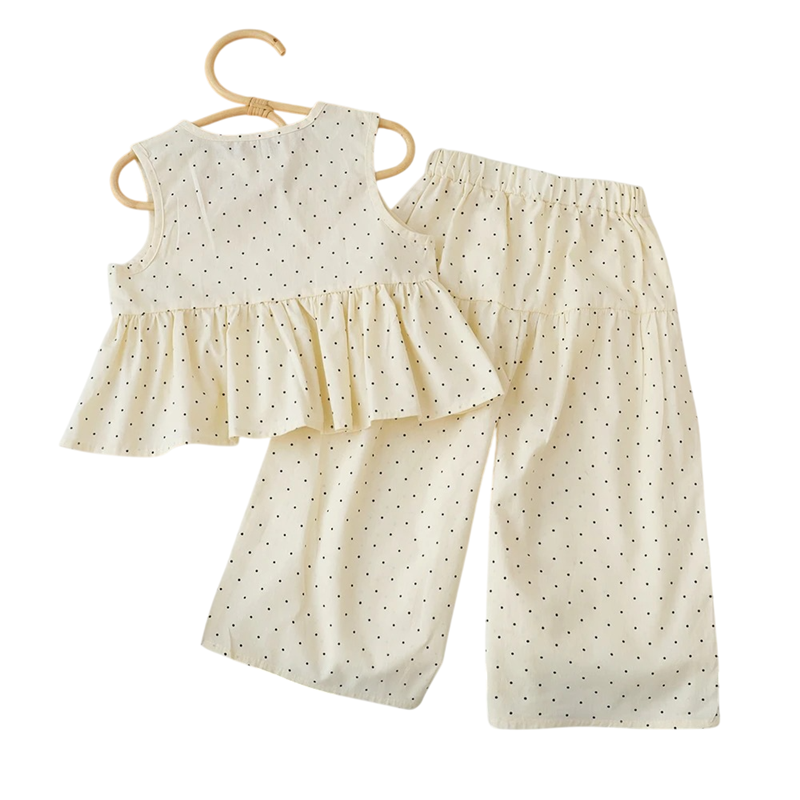 Detský dievčenský letný set tielko so širokými ramienkami na gombíky a nohavice na gumu Béžová súprava s čiernymi bodkami