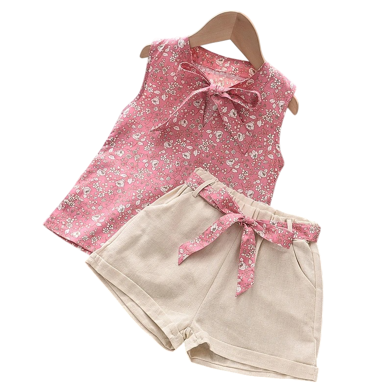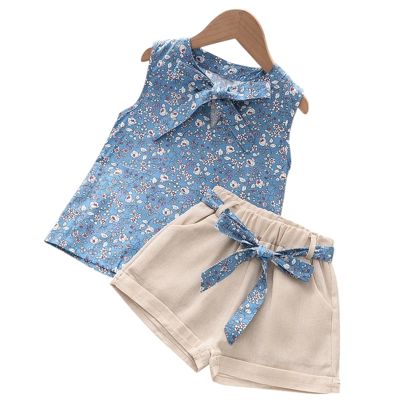 Dievčenská letná súprava béžové kraťasy s mašličkou a tielko s kvetinovým vzorom V výstrih zaväzovanie na šnúrku