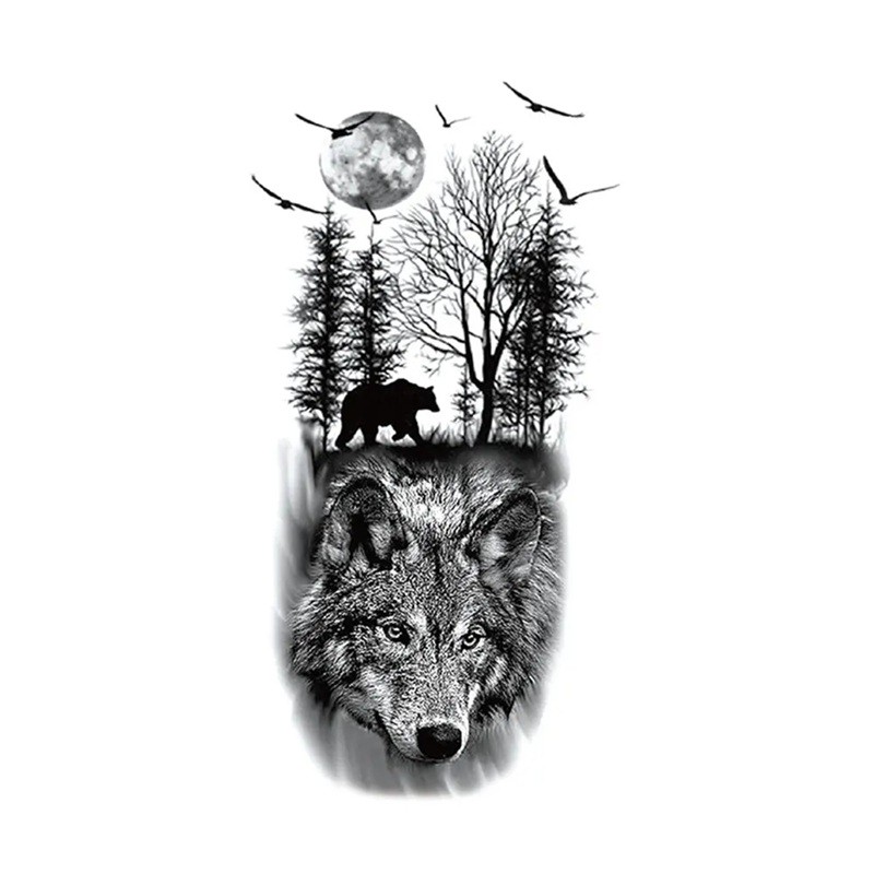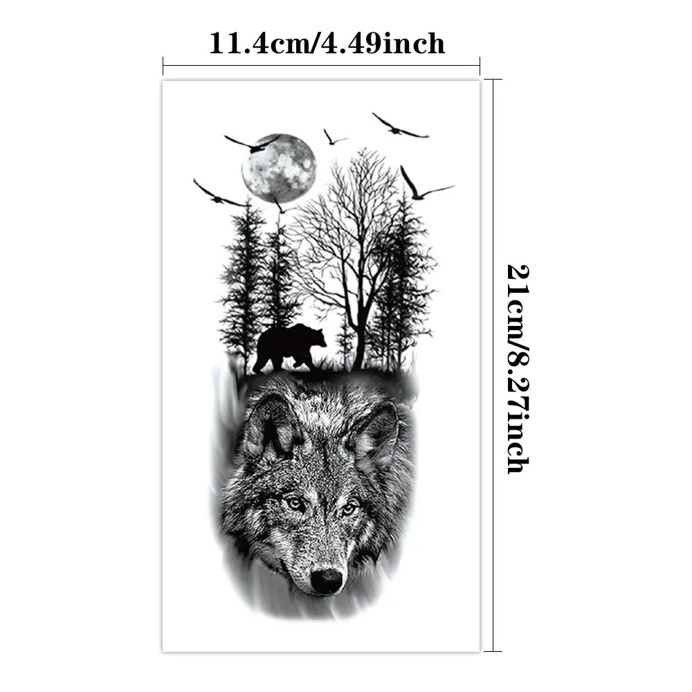 Dočasné vodotesné tetovanie 21 x 11,4 cm Motív vlk les medveď mesiac Nalepovacie tetovanie Štýlová telová ozdoba Divoká príroda