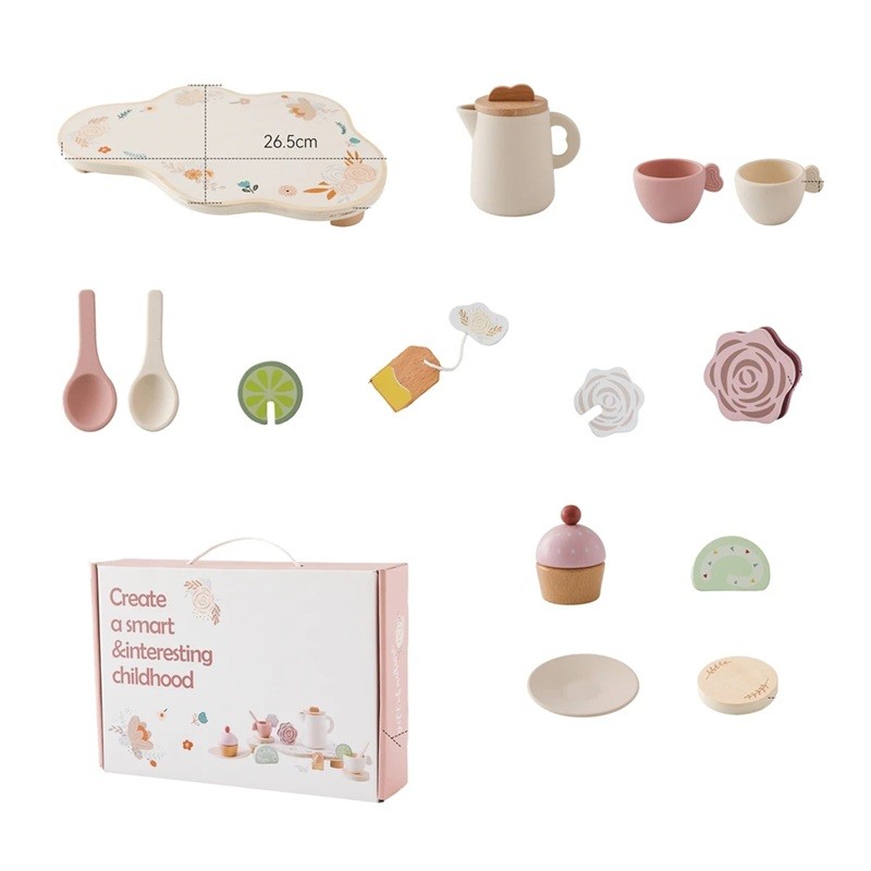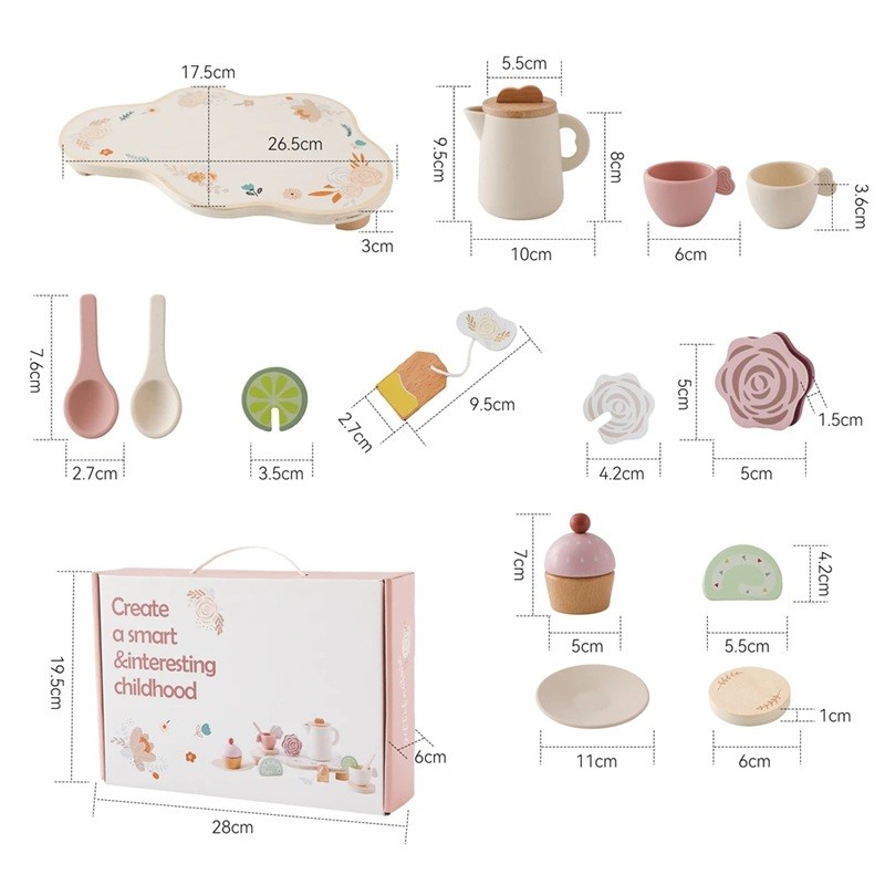Táto drevená Montessori čajová sada pre deti je navrhnutá tak, aby spájala zábavu s učením a rozvíjala prirodzené schopnosti dieťaťa. Deti môžu vďaka tejto sade napodobňovať dospelých pri príprave a servírovaní čaju, čím si precvičujú jemnú motoriku, predstavivosť a sociálnu interakciu. Sada obsahuje kanvicu, 2 hrnčeky, 2 lyžičky, 2 podložky, cukráreň a podnos, takže deti môžu realisticky „servírovať čaj“ pre svojich priateľov či rodinu.