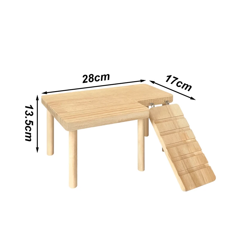 Vďaka kompaktným rozmerom 28 × 17 × 13,5 cm sa plošina hodí do väčšiny bežných klietok pre morčatá, křečky, potkany či menšie králiky. Ľahká, ale stabilná konštrukcia zabezpečí bezpečný pohyb po rebríku aj na hornej ploche. Hladké hrany a starostlivo opracované drevo zabraňujú poraneniu a zvieratá môžu materiál aj bezpečne ohlodávať.