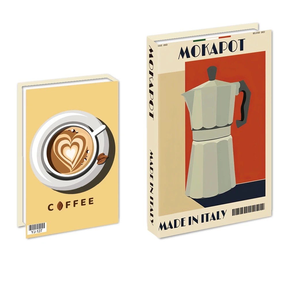 Štýlová falošná kniha s úložným priestorom Mokapot Vyrobené v Taliansku zaujme výrazným retro dizajnom inšpirovaným ikonickou moka kanvičkou. Kombinácia teplých farieb a grafického motívu kávy pôsobí originálne a zároveň útulne. Na prvý pohľad pripomína tematickú publikáciu o talianskej kávovej kultúre, ktorá dokonale zapadne do knižnice, kuchyne aj obývacej izby.