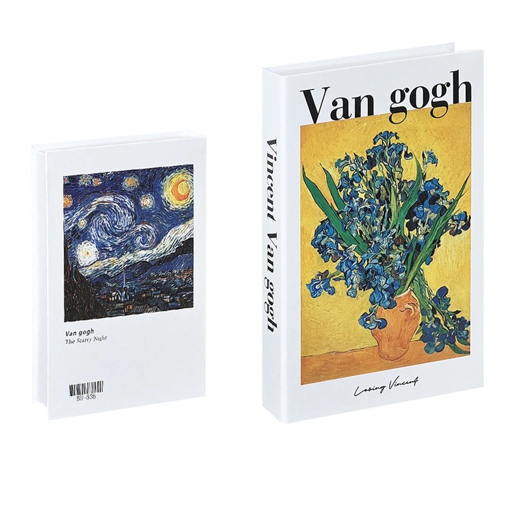Štýlová falošná kniha s úložným priestorom inšpirovaná slávnymi obrazmi Van Gogh pôsobí ako elegantná umelecká publikácia. Prednú stranu zdobí reprodukcia ikonických diel vrátane motívu hviezdnej noci a kvetín vo váze, čo dodáva celej dekorácii výrazný a kultivovaný vzhľad. Na prvý pohľad zapadne medzi ostatné knihy, ale v skutočnosti ukrýva praktický úložný priestor.