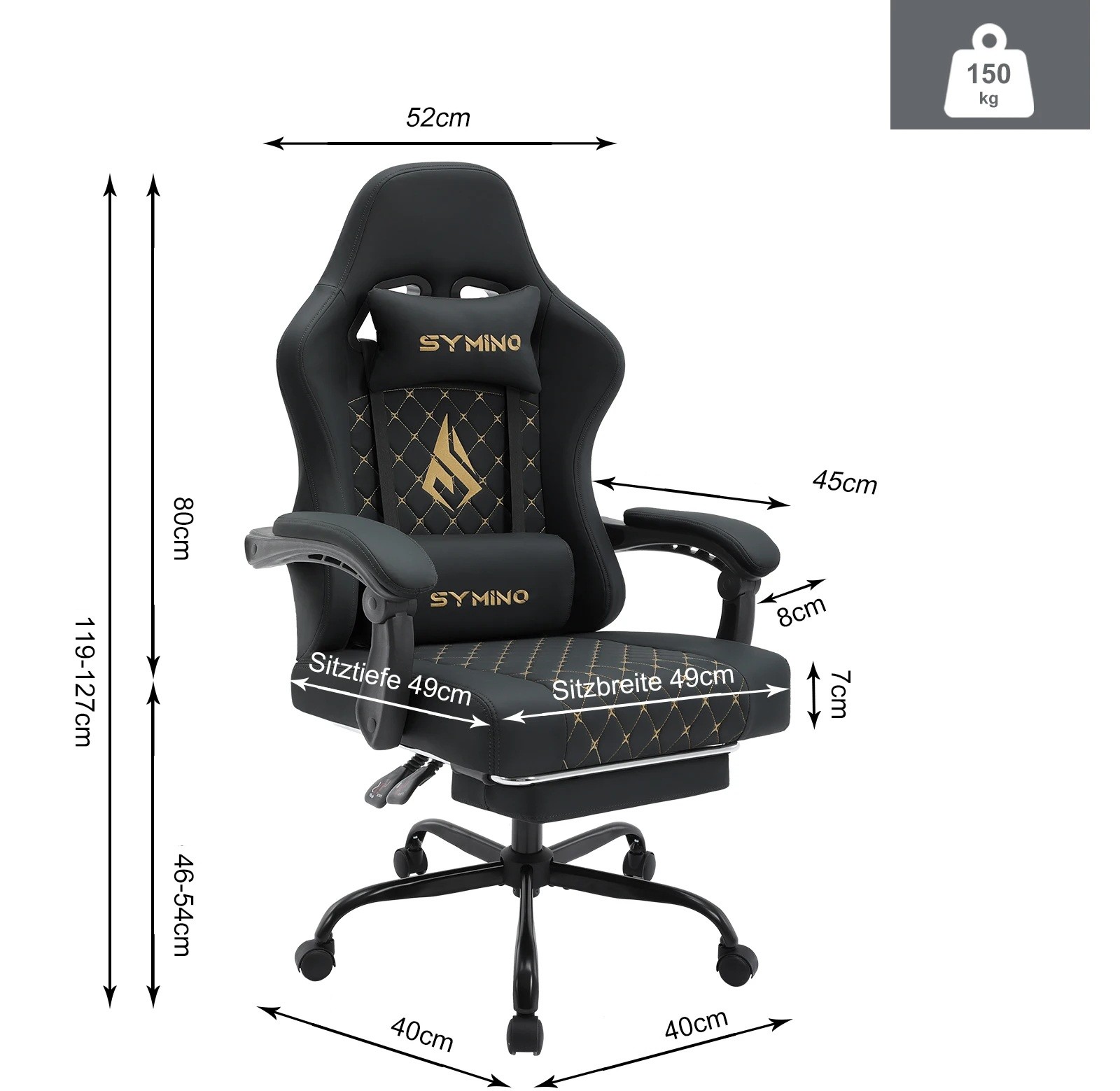 • Rozmery: výška 119–127 cm, hĺbka sedadla 49 cm, šírka sedadla 52 cm, výška sedadla 46–54 cm, výška opierky chrbta 80 cm