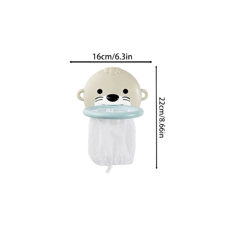 Tento roztomilý koš na vodné hádzanie s motívom šedej vydry premení každú kúpeľ na zábavnú hernú aktivitu. Koš má pevnú plastovú konštrukciu v príjemnej šedej farbe, tvarovanú ako hlavička vydry s typickým výrazom, guľatými ušami a čiernym čumáčikom. V prednej časti je hladký šedý okraj, do ktorého je uchytená svetlo biela sieťovina. Sieť je mäkká, priedušná a rýchlo schne, takže je ideálna na denné používanie. Zadná časť koša je vybavená silnými prísavkami, ktoré umožnia koš bezpečne pripevniť na hladké povrchy, ako sú dlaždice alebo vaňa. Súčasťou sady je jedna mäkká loptička o veľkosti 6.5 cm s kresleným obličajom zvieratka. Farba loptičky je náhodná – môže byť žltá, svetlo béžová alebo hnedá.