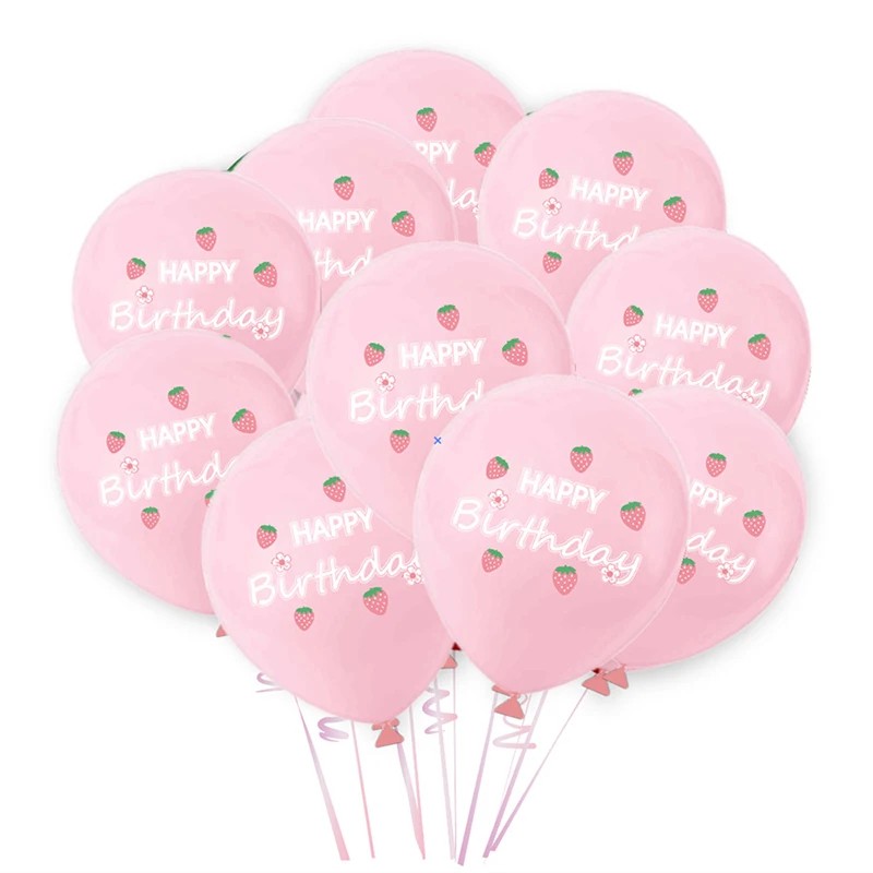 Balónky majú svetlo rúžový základ, na ktorom je umiestnený dekoratívny potlač s nápisom Happy Birthday a malými jahodami. Tento motív môže byť vhodný najmä pre narodeninové oslavy alebo tematické párty zamerané na ovocné motívy.