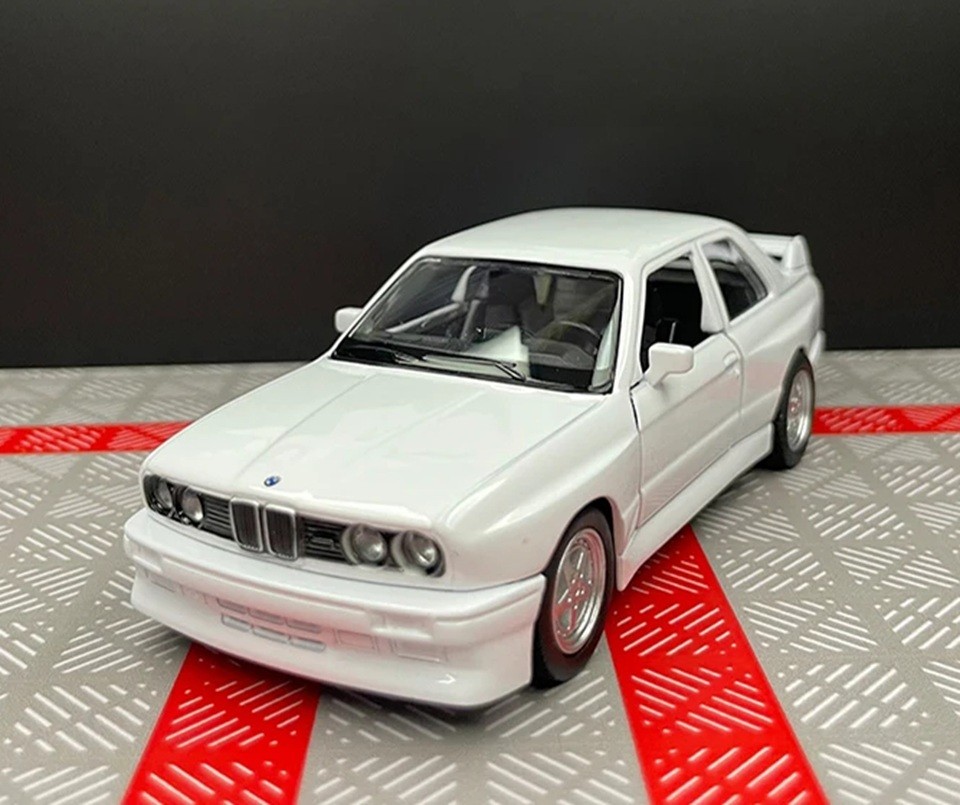 Model auta BMW M3 1987 1:36 12,2 × 4,5 × 3,5 cm Kovový zberateľský model Zinkovo-hliníkové telo Retro športový automobil dekorácia