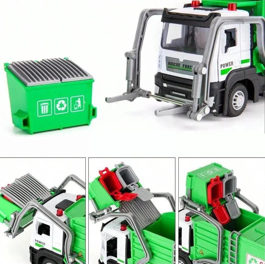 Model disponuje pevným prevedením a kvalitným spracovaním, ktoré zaisťuje dlhú životnosť hračky. Súčasťou sady je tiež odpadkový koš, ktorý umožňuje realistickú manipuláciu pri hraní. Praktická dĺžka modelu 19,5 cm poskytuje dostatočnú veľkosť pre detailné spracovanie aj jednoduché ovládanie detskými rukami. Vďaka prepracovaným detailom a funkčným prvkom je hračka vhodná pre každodenné hranie. Sada obsahujúca smetiarske vozidlo a odpadkový koš rozširuje možnosti hry a zvyšuje jej zábavnosť. Tento model je zároveň ideálny ako darček pre deti so záujmom o pracovnú techniku.