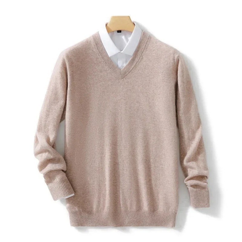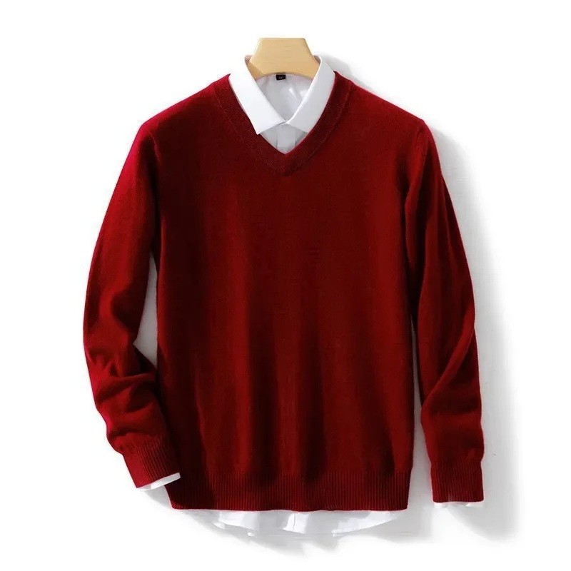 Pánsky sveter s dlhým rukávom a výstrihom do V Jednobarevný elegantný pletený sveter Vlna a elastické vlákna Jesenná zimná móda