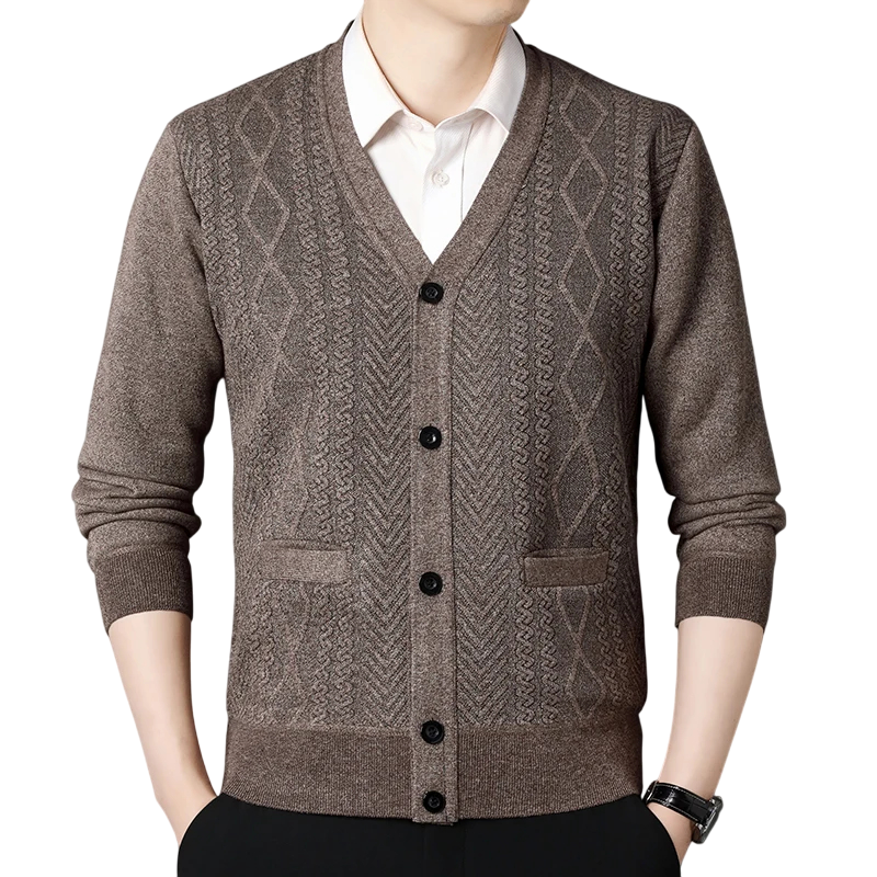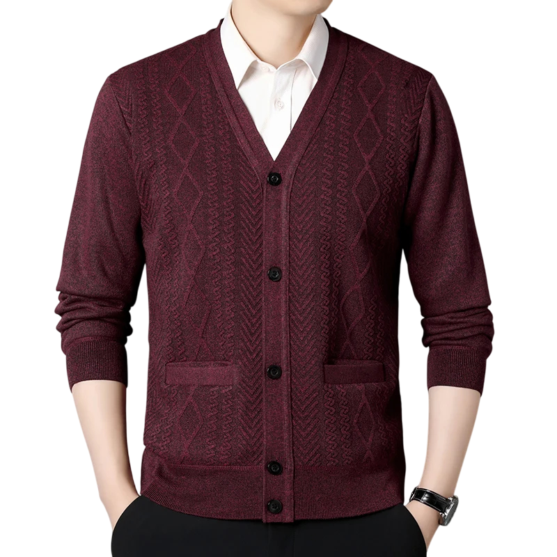 Elegantný pánsky svetrový kardigan je ideálnou voľbou pre každodenné nosenie aj formálnejšie príležitosti. Vďaka výstrihu do V pôsobí nadčasovo a ľahko sa kombinuje s košeľou alebo tričkom. Zapínanie na praktické gombíky dodáva klasický vzhľad a umožňuje pohodlné vrstvenie. Materiál z kvalitného polyesteru poskytuje mäkkosť, odolnosť a dlhú životnosť. Tento jednobarevný sveter s jemným vzorom ponúka štýl aj komfort v jednom.