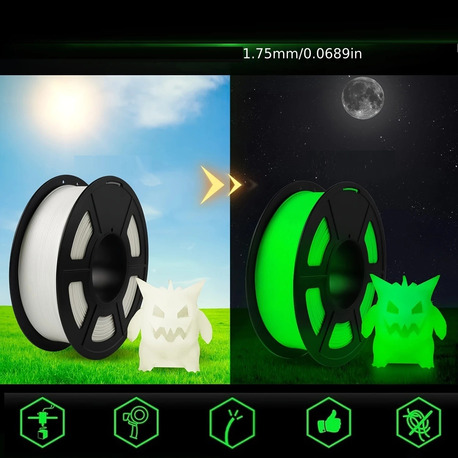 Céz deň má tento filament klasický biely odtieň a správa sa ako bežné PLA. Až pri vystavení svetlu, či už prirodzenému alebo umelému, sa v ňom začne ukladať energia, ktorá po zotmení spôsobí žiarivý zelený efekt. Najviac sa osvedčuje intenzívne nasvietenie pomocou slnka, silného LED svetla alebo UV zdroja, kedy sa výdrž svitu aj jeho jas zvýši. Po dostatočnom osvite dokáže materiál žiariť aj niekoľko desiatok minút, čo z neho robí skvelú voľbu pre dekorácie do interiéru, detské izby, tematické ozdoby aj nočné doplnky.