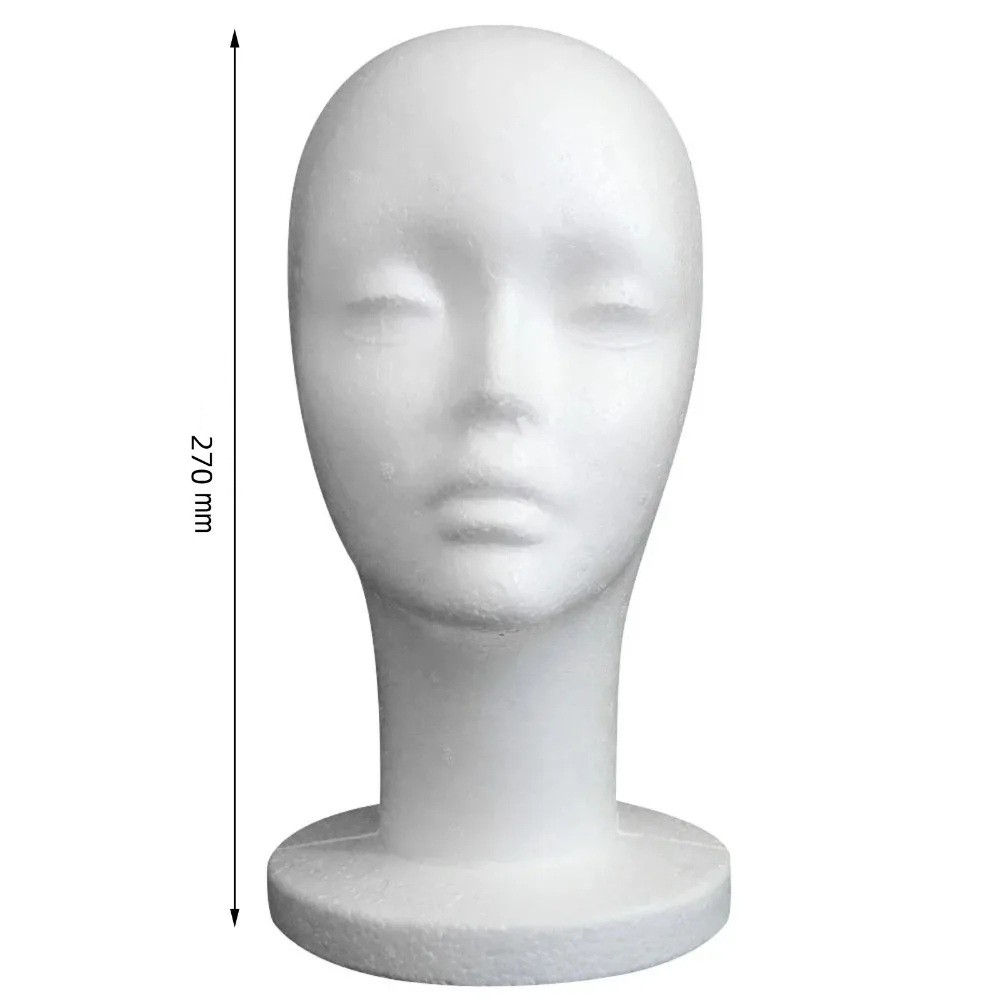 Praktická polystyrénová dámska hlava na paruky, okuliare a čiapky. Ideálna na prehľadné skladovanie a prezentáciu s výškou 27 cm. Celý popis