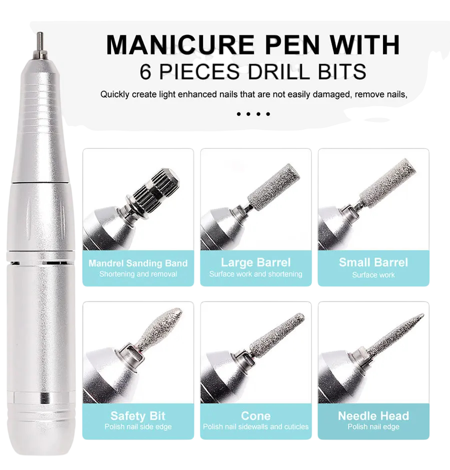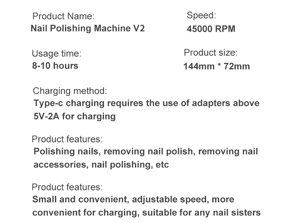 Prenosná elektrická brúska na nechty 45000RPM s LCD displejom, dobíjacia a nízkohlučná manikúra pre salón, 2h dobíjania, 10h výdrž Táto profesionálna elektrická brúska na nechty je navrhnutá pre efektívny a tichý výkon pri manikúre a pedikúre. S otáčkami až 45 000 RPM a inteligentným LCD displejom je ideálna pre všetky typy nechtov, poskytujúca kvalitné a detailné výsledky. Je vybavená dobíjacou funkciou, čo umožňuje až 10 hodín nepretržitého používania po 2 hodinách nabíjania. Vďaka nízkej hlučnosti a kompaktným rozmerom je skvelá ako pre domáce použitie, tak pre profesionálne salóny. Táto multifunkčná brúska zahŕňa širokú škálu nadstavcov a príslušenstva, ktoré umožnia prispôsobiť ju rôznym potrebám a aplikáciám. Môžete ju využiť nielen na úpravu nechtov, ale aj na spracovanie kože, odstraňovanie ztvrdnutej kože alebo na vytváranie rôznych tvarov a dekorácií. Dizajn je ergonomický, čo zabezpečí pohodlné držanie aj pri dlhšej práci. **LCD displej** zobrazuje aktuálnu rýchlosť a stav batérie, čo zaisťuje plnú kontrolu nad celým procesom. **Vlastnosti produktu:** - **45000RPM** otáčky pre rýchlu a efektívnu prácu - **LCD displej** pre zobrazenie rýchlosti a stavu batérie - **Nízkohlučný** motor pre tichý a komfortný chod - **Až 10 hodín** prevádzky na jedno nabitie po 2 hodinách dobíjania - **Multifunkčné využitie** – vhodná pre manikúru, pedikúru aj ďalšie kozmetické úpravy **Obsah balenia:** 1x hlavný stroj 1x nadstavec 1x držiak na pero 1x prepojovací kábel 1x nabíjací kábel 1x sada vrtákov na nechty 1x užívateľská príručka Táto brúska na nechty predstavuje ideálny nástroj pre profesionálov aj domácich používateľov, ktorí chcú dosiahnuť dokonalý výsledok pri úprave nechtov. Je kompaktná, výkonná, tichá a navrhnutá tak, aby vyhovovala širokému spektru potrieb. Je perfektnou voľbou pre každého, kto hľadá vysokú kvalitu a efektivitu v oblasti manikúry a pedikúry.