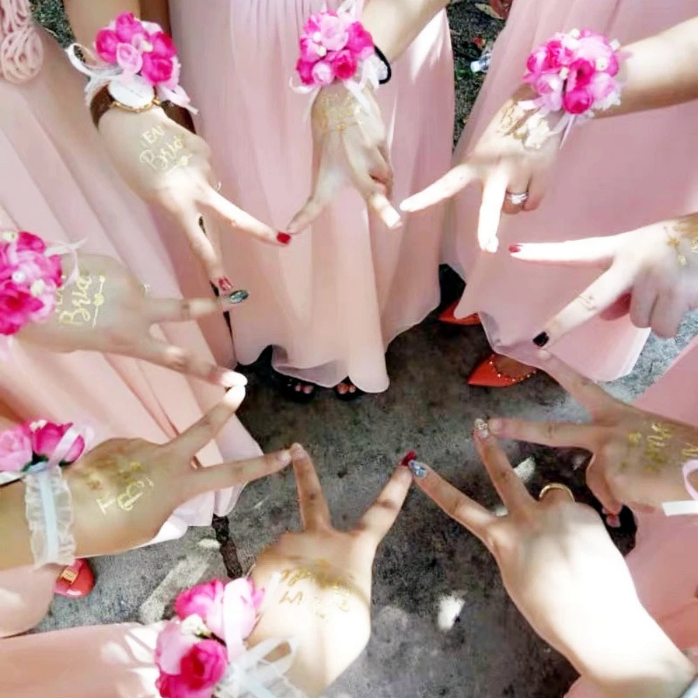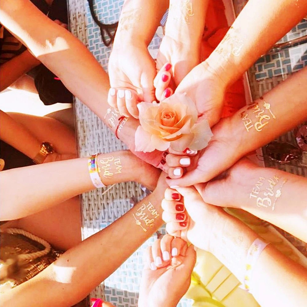Táto sada 10 dočasných tetovaníe s motívmi Bride Tribe je originálnym doplnkom na rozlúčku so slobodou alebo dámsku oslavu. Tetovania obsahujú rôzne zlaté nápisy a symboly ako „Bride Tribe“ (Nevestina skupina), „Team Bride“ (Tím nevesty), „Bride To Be“ (Budúca nevesta) a ďalšie svadobné motívy. Metalický zlatý efekt pôsobí slávnostne a krásne vynikne na fotografiách. Motívy sú zasielané v náhodnom výbere.