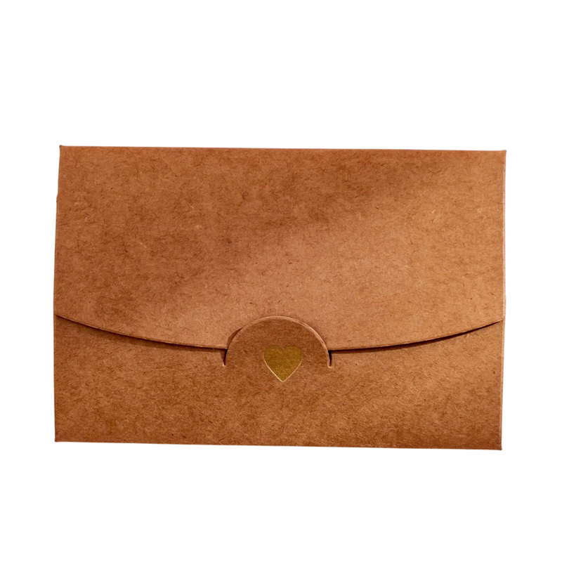 Každá obálka je vyrobená z pevného papiera a dodávaná v rôznych farebných variantoch, ktoré dodajú vášmu daru osobitý vzhľad. Elegantné uzatváranie pomocou srdiečka nielenže dobre drží obsah vo vnútri, ale zároveň pôsobí dekoratívne.