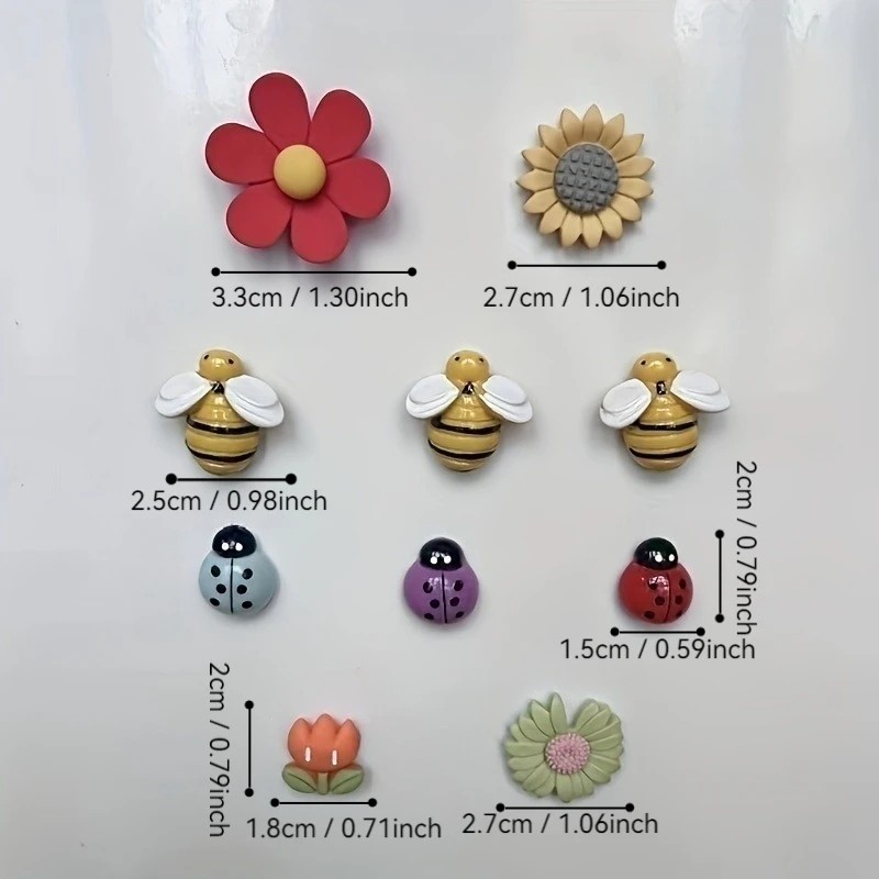Táto sada 10 veselých magnetiek prináša do domácnosti hravosť a farby. Magnetky majú podobu roztomilých kvetov, včiel a lienok a premienia každú chladničku alebo tabuľu na originálne a prehľadné miesto. Sú vhodné na pripevnenie poznámok, fotiek alebo detských výkresov. Vďaka kompaktnej veľkosti a silnému magnetu dobre držia a sú praktickým aj estetickým doplnkom interiéru.