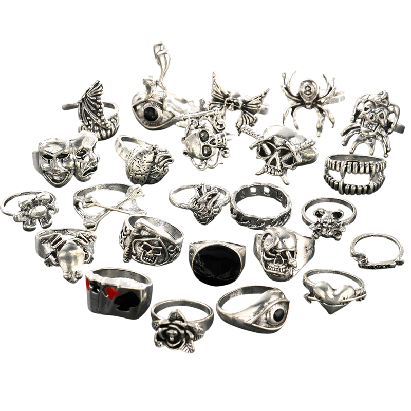 - Sada obsahuje 24 prstenov s rôznymi kostlivými motívmi, ktoré oslovia fanúšikov gotického štýlu