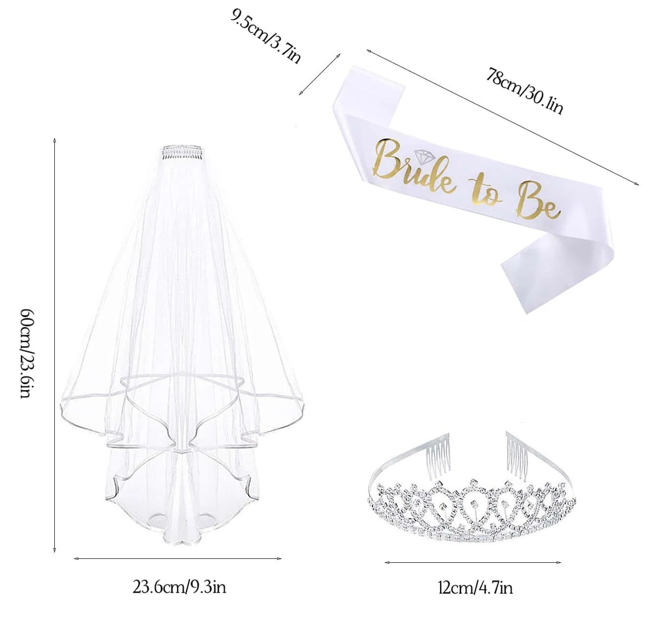 Táto svatebná sada Bride To Be je ideálnym doplnkom pre budúcu nevestu na rozlúčku so slobodou alebo inú svatebnú oslavu. Sada obsahuje šerpu s nápisom „Bride To Be“ (Budúca nevesta), biely závoj s hrebienkom pre jednoduché upevnenie a ozdobnú čelenku s kamienkami. Všetky prvky sú farebne zladené a vytvárajú výrazný a slávnostný vzhľad. Vďaka ľahkému prevedeniu sú doplnky pohodlné na nosenie počas celej akcie.