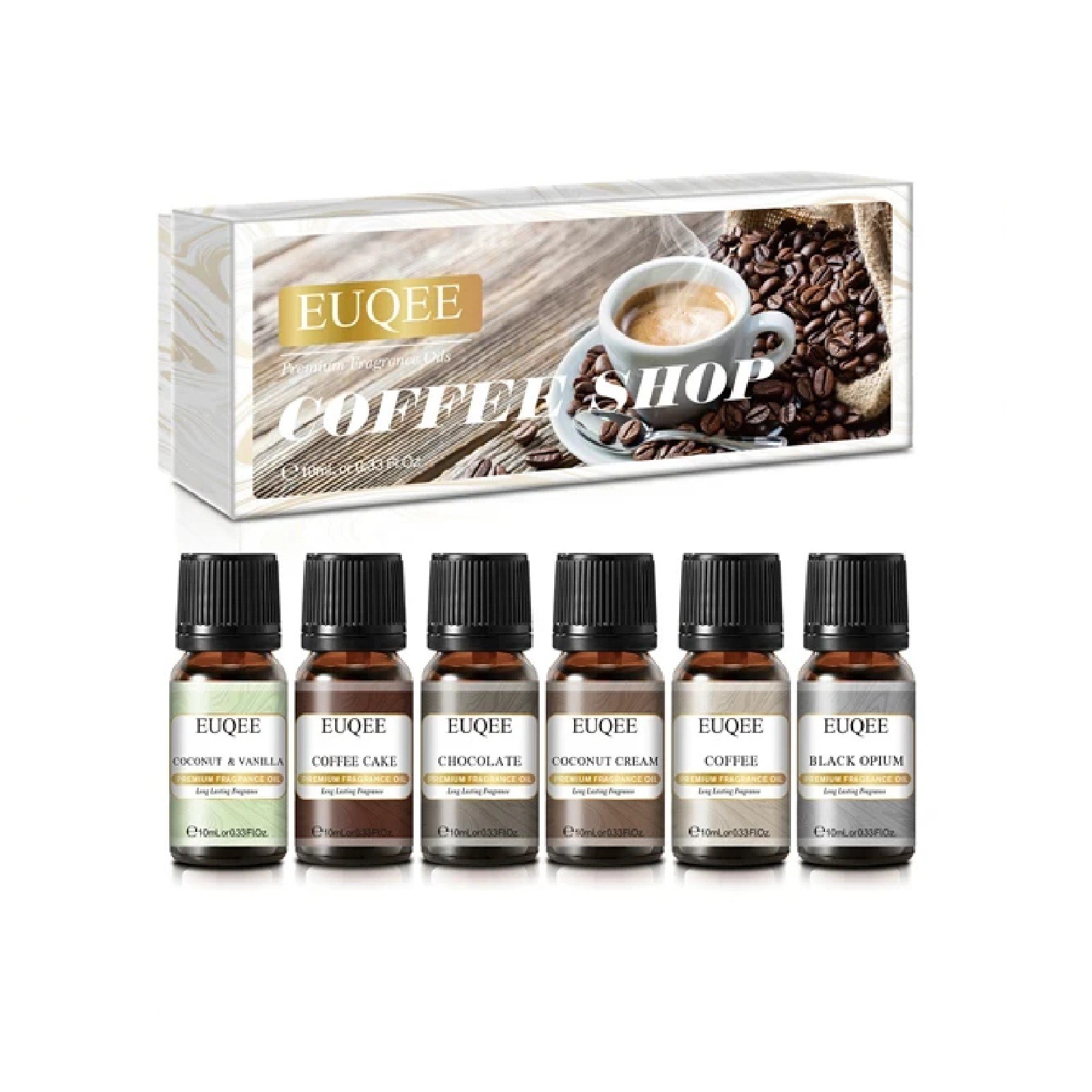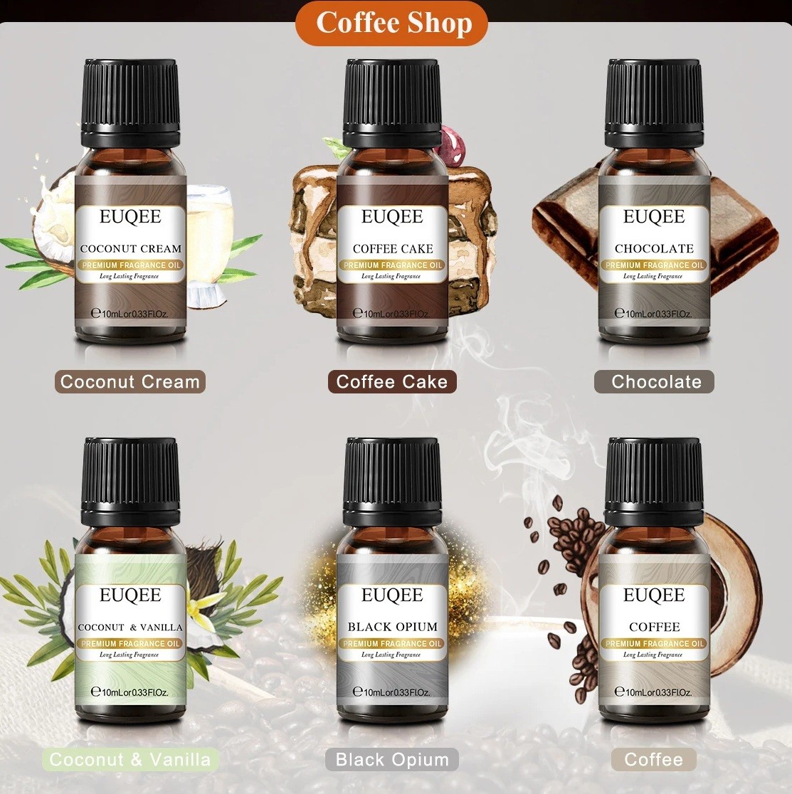 Každá fľaštička obsahuje inú vôňu, konkrétne kokosový krém, kakaový koláč, čokoládu, kokos s vanilkou, čierne opium a kávu. Táto kombinácia prináša sladké aj výraznejšie aromatické tóny vhodné pre rôzne priestory. Menší objem jednotlivých olejov umožňuje ich striedanie bez zbytočného plytvania. Sada je vhodná ako na bežné použitie, tak aj ako praktický darček.