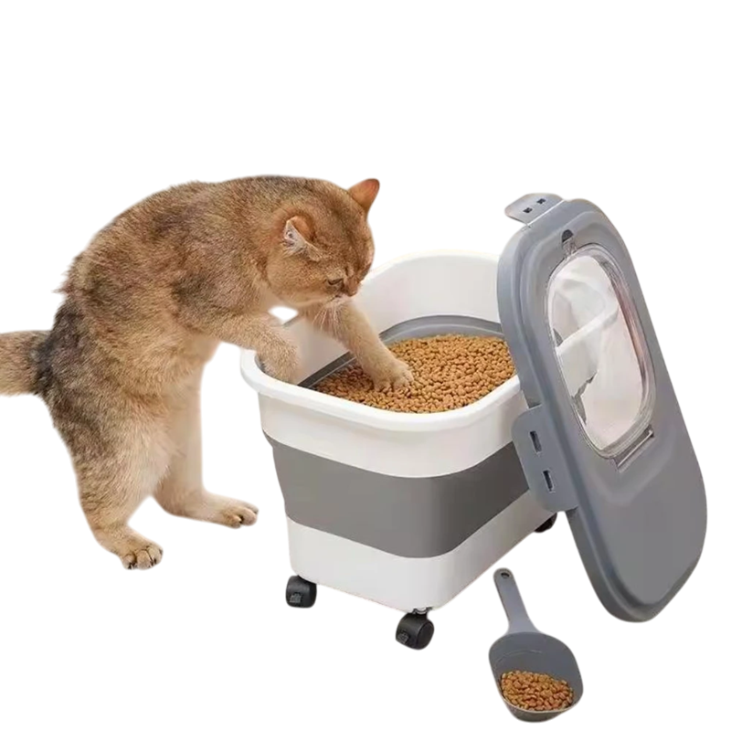 Vďaka odnímateľným kolieskam je možné zásobník pohodlne presúvať po miestnosti bez námahy. Priehľadné viečko umožňuje okamžitú kontrolu množstva obsahu, takže vždy viete, kedy je potrebné doplniť zásobu. Tento univerzálny kontajner je vhodný nielen na krmivo pre psov či mačky, ale aj na ryžu, múku, cestoviny alebo iné suché produkty.