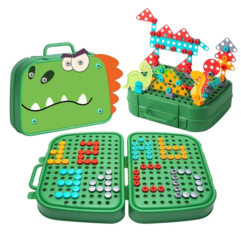 Stavebnica 228 ks Kufřík 22 x 25 cm Šroubovacia sada s dinosaurami Farebné skrutky a dieliky Kreatívny montážny kufrík pre deti