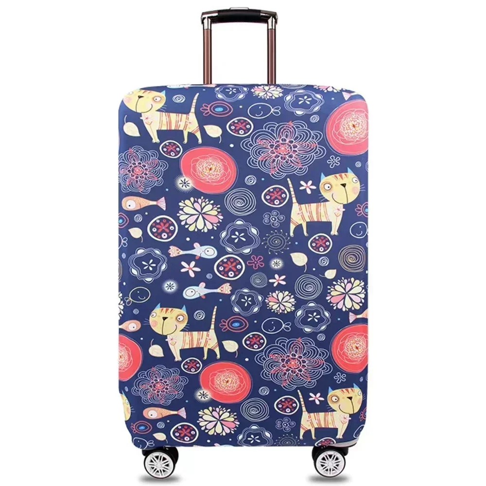Strečový potah na cestovný kufor s motívom mačiek a kvetín 80 cm elastická tkanina modrá ochranný obal na veľké zavazadlo pre cestovanie