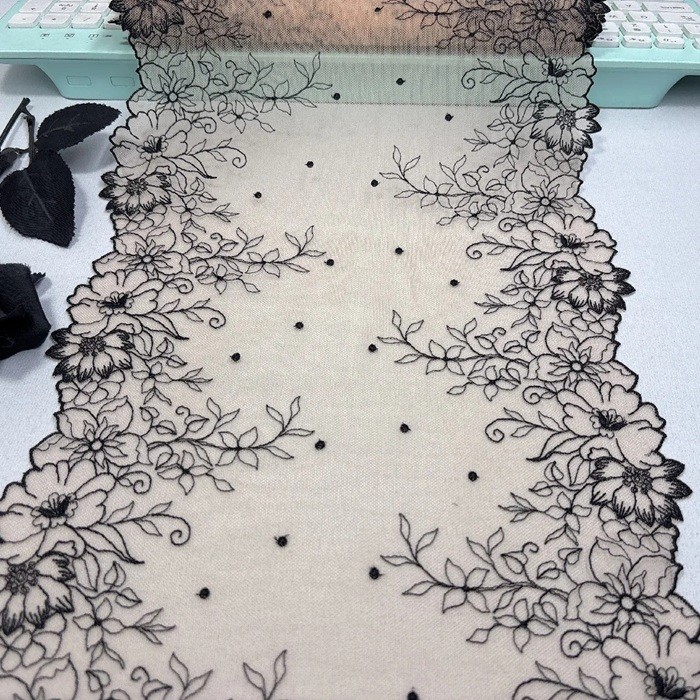 - Čierna vyšívaná krajková sieťovina s rastlinným motívom