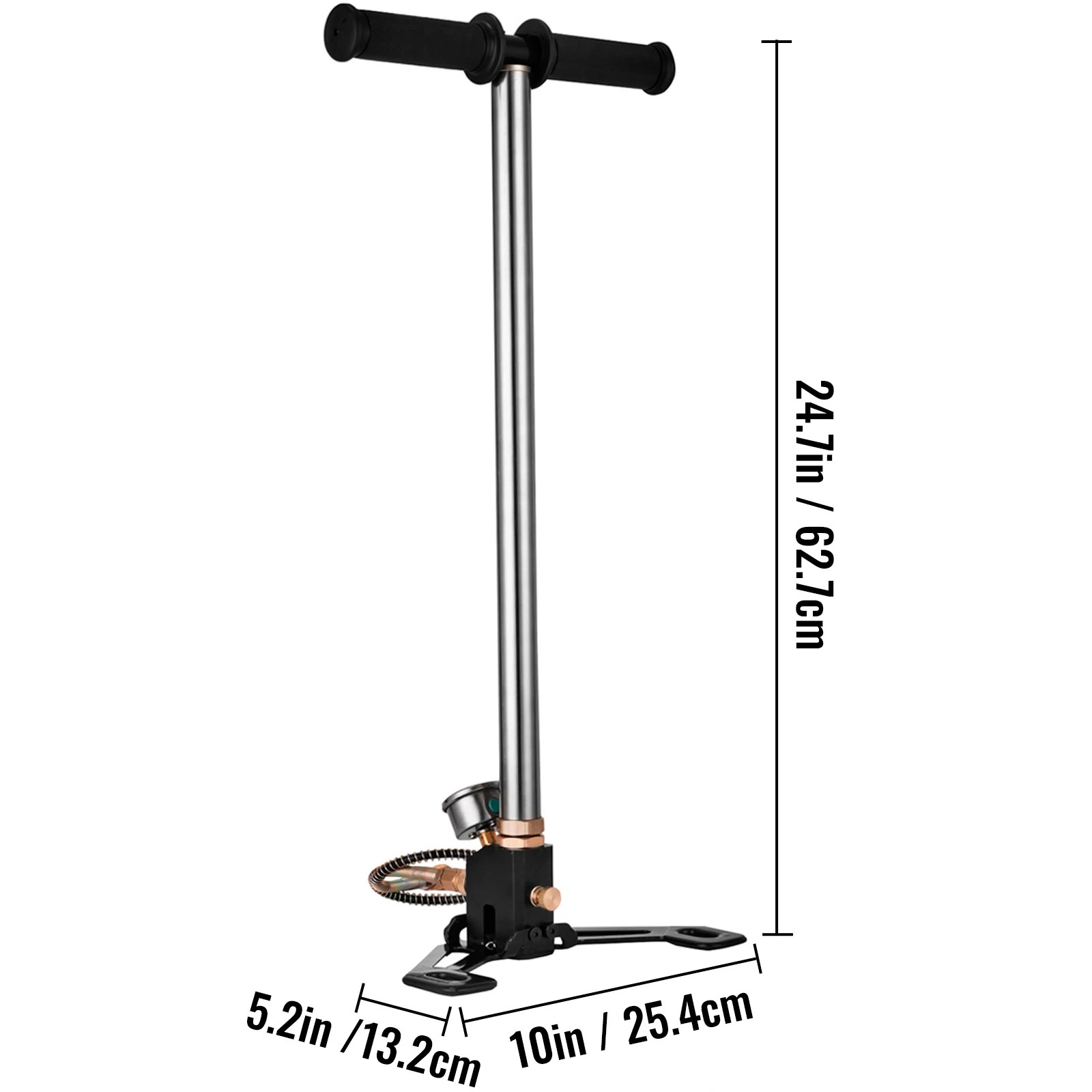 Vysokotlaková ručná pumpa 4500 psi 3stupňová 62,7 × 25,4 × 13,2 cm strieborná pumpa na pneumatiky a lopty s manometrom