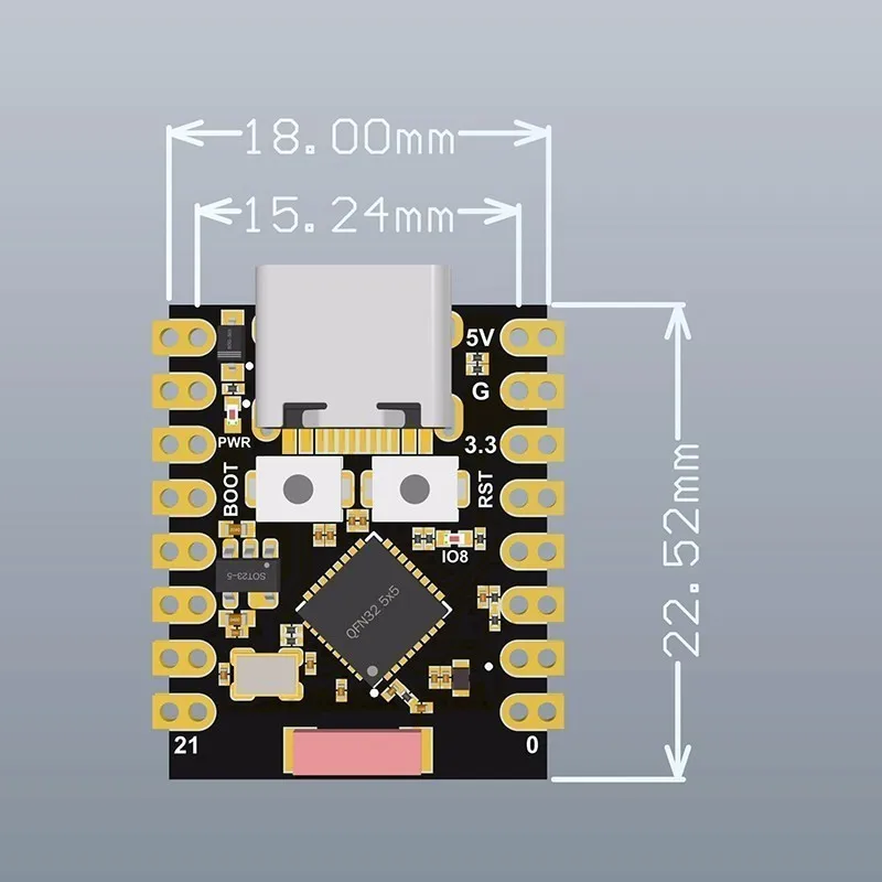 Vývojová doska ESP32-C3 SuperMini predstavuje ideálne riešenie pre vývoj inteligentných zariadení a projektov IoT. Vďaka integrovanému WiFi a Bluetooth rozhraniu ponúka široké možnosti pripojenia, pričom zachováva kompaktné rozmery iba 18 × 22,5 mm. Je kompatibilná s prostredím Arduino IDE, čo uľahčuje programovanie aj začiatočníkom. Doska obsahuje 4MB Flash pamäť a 400KB SRAM, čo poskytuje dostatočný priestor pre pokročilé aplikácie a vývojové projekty.