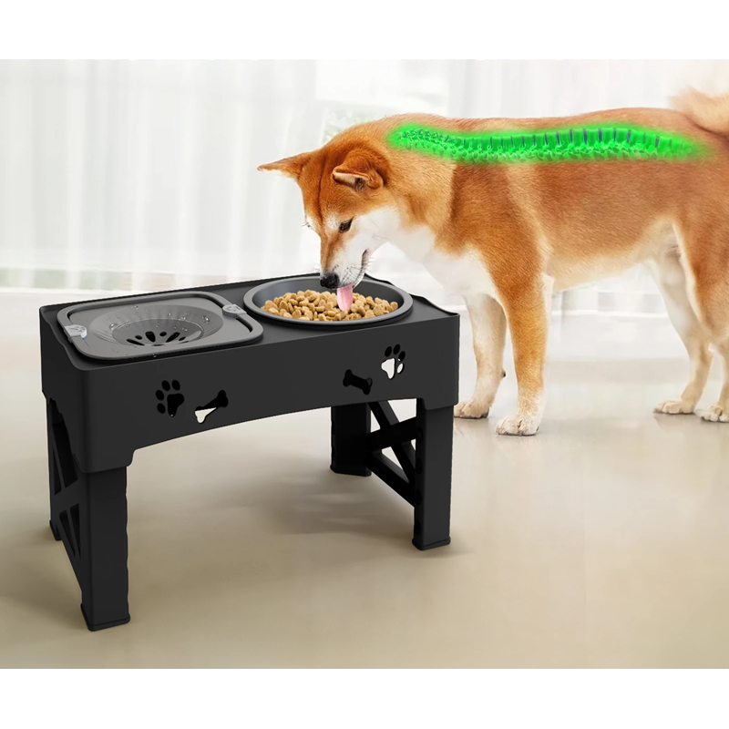 Tento vyvýšený stojan pre psov prináša komfort a zdravší spôsob kŕmenia aj pitia. Je vybavený slow feeder miskou na krmivo, ktorá spomaľuje príjem potravy a podporuje lepšie trávenie, a miskou na vodu s konštrukciou odolnou proti striekajúcej vode. Rozmery 43 x 23,3 cm zabezpečujú dostatočný priestor pre pohodlné kŕmenie, a nastaviteľná výška až 31 cm umožňuje prispôsobenie rôznym veľkostiam psov. Vyrobené z odolného ABS materiálu, ktorý je bezpečný pre potraviny a ľahko sa čistí.